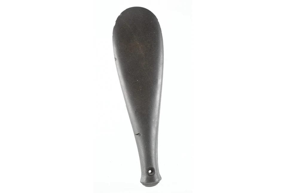 Similar in aesthetic and use to the patu, the mere pounamu is a one-handed weapon featuring a flat elongated blade with a sharp striking edge. A warrior would use it to strike the head, jaw, and ribs of their enemy. It was one of the most valued weapons to Māori, with the stone’s strength making it treasured even more so than gold.